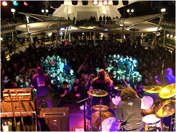 Imagine a 14 story high and 268 meter (880ft) long floating luxury resort. This cruise liner offers everything you could dream of having on a floating Heavy Metal Paradise including three stages, one in the main theater in which we remove some of the (very comfortable) leather seating, one in the more intimate lounge that gives you a local club atmosphere and last but not least the custom built open air stage constructed on the outside pool-deck, surrounded by a swimming pool, plenty of room to sunbathe and even hot tubs to soak in while you watch the shows!